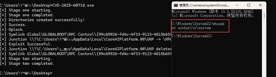 360漏洞研究院已复现Windows 11 PolicyConfiguration 计划任务特权提升漏洞(CVE-2025-60710),并通过该漏洞成功获取SYSTEM权限。